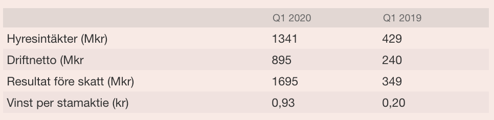 Uppgången går såklart att motivera till viss del. Jämfört vi Q1 2019 med Q1 2020 har bolaget uppvisa tillväxt på alla fronter. Samma gällde även under årets tre första månader då bolaget skrev upp värdet på SBB:s fastigheter med 1.628 Mkr. Siffran motsvarar 66 procent av värdeökningen under hela 2019.