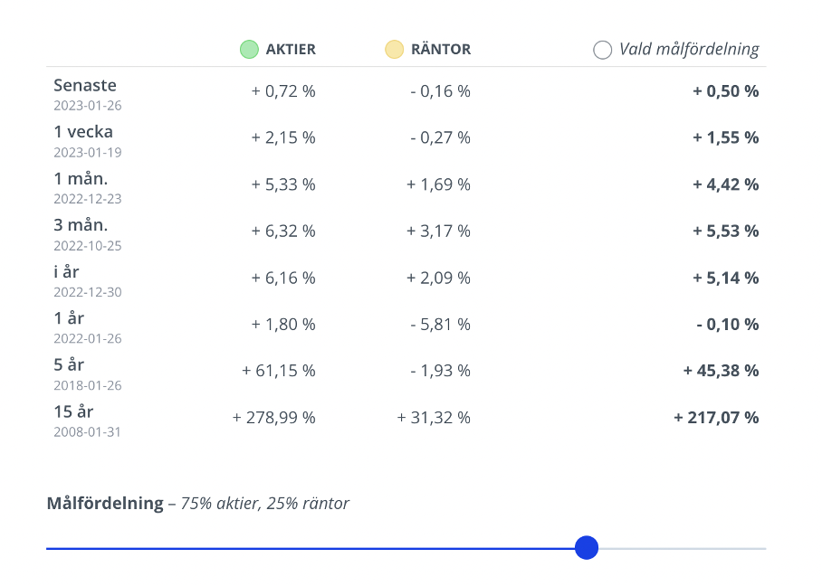 Med en fördelning på 75% aktier och 25% räntor har avkastningen sedan 2018-01-26 stigit med drygt 45%. Vill man som investerare ha mer risk i portföljen, alltså möjlighet till högre (och lägre) avkastning, kan man växa till 100%.