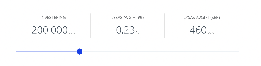 Den högsta avgiften du betalar till Lysa är 0,24%. Men ju mer du investerar, desto lägre blir avgiften. Om det investerade beloppet uppgår till 200 000 blir avgiften 0.23%. Om du investerar mer än 1,1 miljon kronor blir avgiften 0.21%. Lägsta möjliga avgift är 0,15%.
