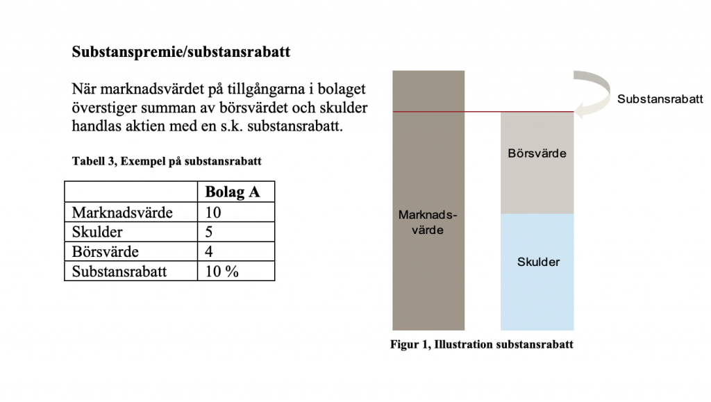 Substansrabatt är alltså när bolagets totala börsvärde är läge än bolagets bokförda tillgångar, detta går att applicera på både fastighetsbolag och investmentbolag. Som tumregel borde investerar alltid försöka köpa ett investmentbolag till så hög rabatt som möjligt. Det betyder att du köper den underliggande portföljen till ett rabatterat pris.