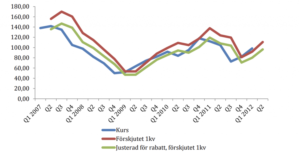I diagrammet ovanför visas den historiska aktiekursen tillsammans med en kurva som visar hur aktien skulle gått om ingen rabatt eller premie fanns, med ett kvartals förskjutning. Vidare visas en till kurva detsamma, fast justerad så att den genomsnittliga rabatten på 13,2 procent är borträknad.